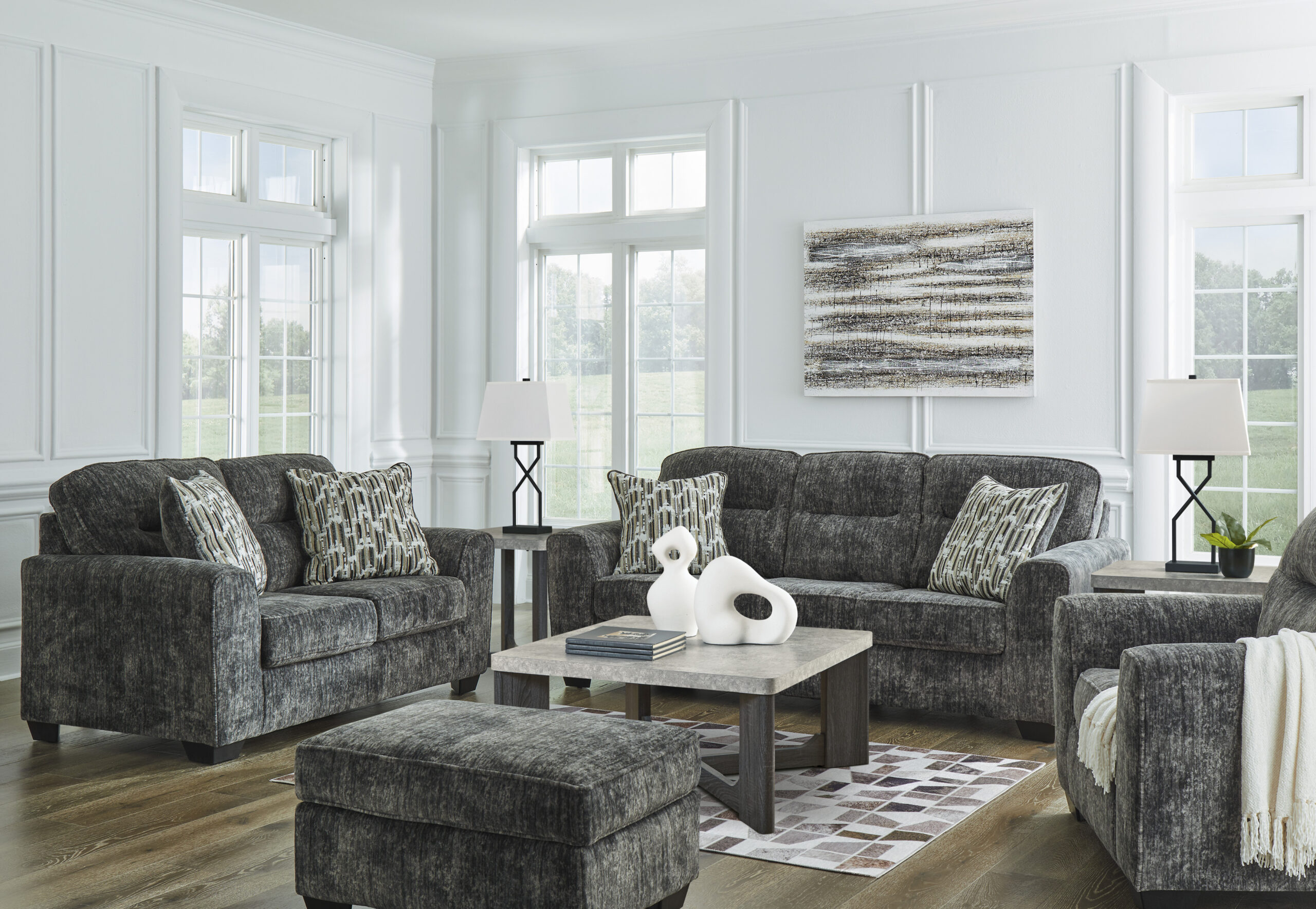The deep charcoal gray upholstery with subtle textured patterns pairs beautifully with the included designer accent pillows, making this set versatile enough to blend with both modern and transitional interiors.